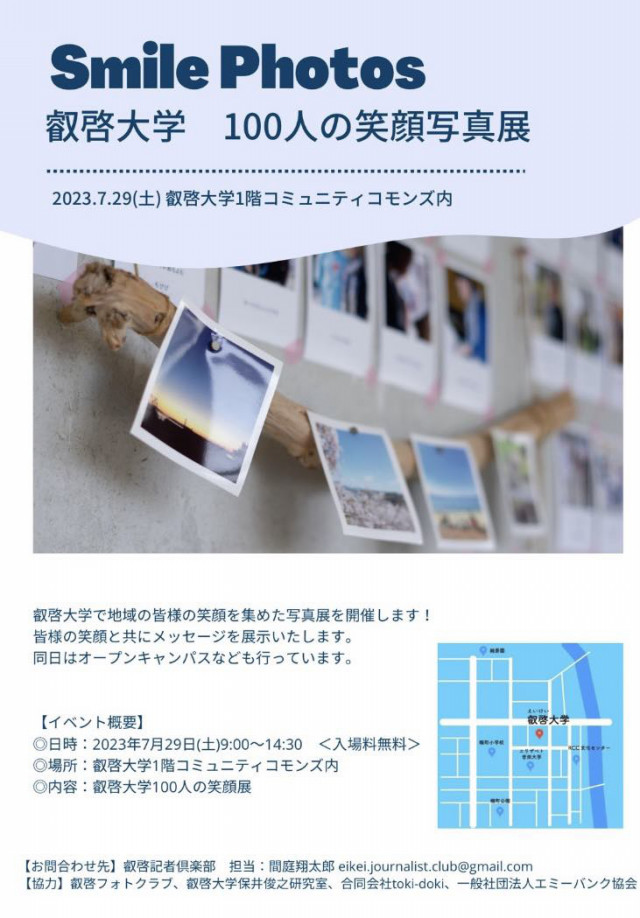 広島県立 叡啓大学にて、叡啓記者倶楽部や叡啓フォトクラブの学生たちが主体となって、地域の人たちの笑顔を撮影した写真展「叡啓大学 100人の笑顔写真展」が開催されます。当日は、オープンキャンパスの日程にも重なっていますので、ふるってご参加ください!