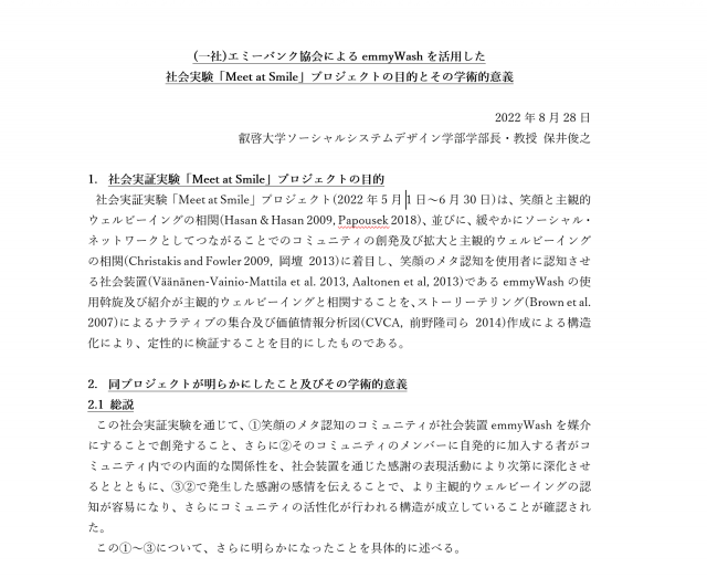 「(一社)エミーバンク協会によるemmyWashを活用した社会実験「Meet at Smile」プロジェクトの目的とその学術的意義」(叡啓大学ソーシャルシステムデザイン学部学部長・教授 保井俊之)