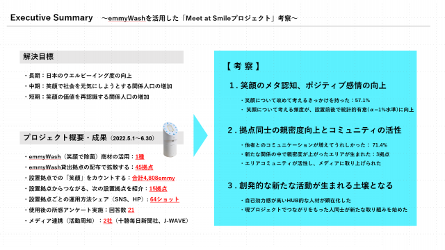 2022年5月1日~6月30日の期間、その実行施策の1つとして、笑顔計測つきの除菌液装置「emmyWash(エミーウォッシュ)」を活用した社会実証実験「Meet at Smileプロジェクト」を企画・展開し、その結果考察と評価をまとめましたので公開します。