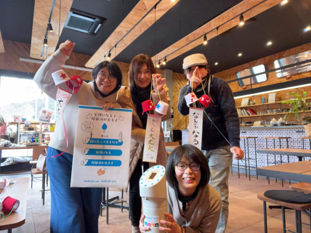岡山県新見市界隈にて、「あなたの笑顔で地域も笑顔に」をスローガンに賛同する団体が集まり、各団体の活動やイベントをつないで、多くの人々の笑顔を引き出す笑顔バトンリレー企画がはじまりました。各賛同団体の活動をつなぐ、その”笑顔バトン”にemmyWashが利用されています! 笑顔バトンリレーの発起人は、同市内でコミュニティカフェ「Toi Toi Toi(トイ・トイ・トイ)」を運営する毛利昌子店長。2月13日には、同店で決起集会が開催されました。