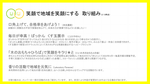 笑顔で地域を笑顔にする取り組み、全国にもいろいろありますね。今後の展開が楽しみです!