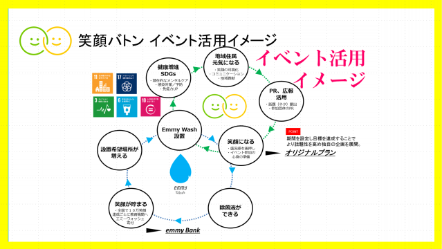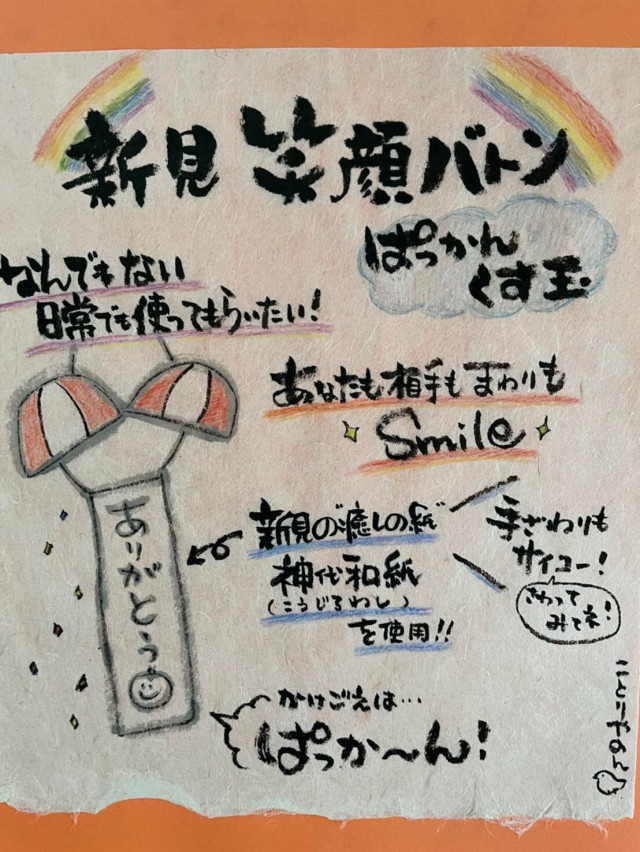 毛利さんいわく、「笑うことで”やってみよう!”、なんとかなる!”と前向きな気持ちが生まれ、笑顔が増えれば地域に活力が生まれます。岡山県新見市は古くから林業がさかんで、笑顔バトンのemmyWashの除菌液には、クロモジなど未利用材の活用で作られた蒸留水を利用し、森林資源の課題への”問い”ともかけあわせているんですよ!」とのこと。