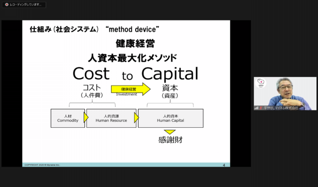 平野: 社会装置は、emmyWashのような機器装置型(contact device)のみならず、コミュニティのような場(community device)の形態であったり、社会システムのような仕組み(method device)の形態であったりします。たとえば、「健康経営」は、人材から人財へ。コストから資本へと変換するまさに社会システム型の社会装置コンセプトに当てはまるわけです(平野さんは、NPO健康経営研究会副理事でもあり、「健康経営」生みの親でもある)。