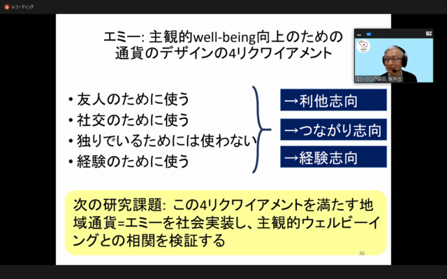 そして、エミーバンク協会 理事 兼 最幸顧問に就任いただいた保井俊之先生(叡啓大学ソーシャルシステムデザイン学部長・教授)には、広島からリモート参加いただき、「温かい恩送りのおカネ ~エミーを未来へ実装する金融」と題して基調講演を行っていただきました。講演内では、ウェルビーイング向上のための通貨のデザインという「エミー&ゼニー」研究の学術的活動の目的や背景、最新の研究成果とともに、いままさに感謝・恩送りのお金「エミー」の社会実装が現代社会で望まれていることが語られました。