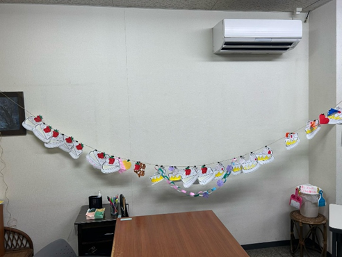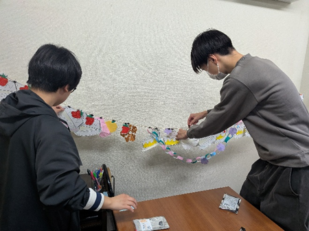 エミーな時間では、高校生が自ら納品用のケーキを吊り下げる場所を、パーティ会場のように輪飾りしてくれました。