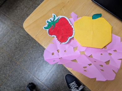 ファシリテーターが少しうらやましそうにしていたところ、参加者の方が「ゆず」を折ってプレゼントしてくれました。さらに「いちばんきれいに塗ったいちごです」と、なぜかファシリテーターへの納品も。思わぬ交流が生まれた、温かいひとときとなりました。